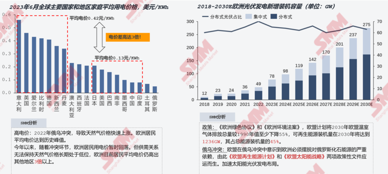 欧洲为全球最大的户储市场。2022年,俄乌冲突爆发,欧洲对俄罗斯天然气的制裁,短期内大幅推高了电价,同时由于能源短缺,部分地区也出现了停电现象。在电价高企和电力不稳定的双重作用下,欧洲户储市场快速发展。